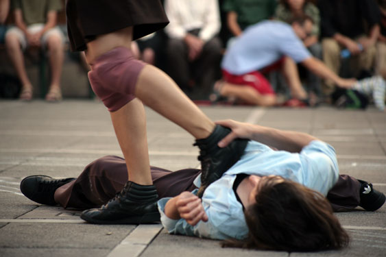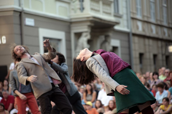 Trajets de Vie : sur les bancs, ou autour, au milieu du passage des piétons, des voitures, des bus, quatre solitudes esquissent une gesticulation parfois acrobatique, parfois au bord de l’invisible : trouées poétiques où le grésillement d’une radio sortira d’un cabas, où des feuilles de journaux se colleront au visage comme un masque de fanfaron, où des capsules de bouteille colorées se dispersent comme une pluie d’enfance. Trajets de Ville constitue l’autre versant. Une hostilité charge l’atmosphère. Un immense vide inhumain se creuse à l’endroit de cette foule où les hommes, les femmes, les vieux, se croisent sans se voir, en s’ignorant. Pire encore : ils se bousculent, s’entrechoquent, s’agressent,ou bien l’amour éclate. Des duos s’esquissent à peine : fragments d’une lutte virile ou amitié, sensualité et rivalité se mélangent dans le souvenir perdu d’un tango ? Ceci est l’inverse de tout ce que l’on pourrait attendre d’un spectacle contemporain (rien de hightech, aucune vidéo, juste cette vieille sonorité rock, et ces vieux corps qui sont les nôtres, proches de la détérioration), mais qui nous parlent tellement de ce que nous sommes aujourd’hui. Paul-Emmanuel Odin