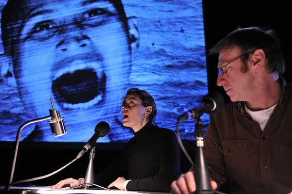 Interpréter une fable contemporaine aussi sombre que comique, comme s’il s’agissait d’une pièce radiophonique, assis à la table, suivant les pages d’un script, interprétant différentes voix et assurant les bruitages, coup de revolver, pluie ou encore friture d’une ligne téléphonique : c’est le pari de Void Story, la dernière création des Britanniques Forced Entertainment. Oscillant entre le dialogue live, l’enregistrement d’effets sonores et le collage d’images, Void Story rend visible un conte singulièrement loufoque : l’histoire de deux personnages embarqués dans une course folle traversant les décombres de notre culture contemporaine. Naviguant d’un paysage urbain à un autre, attaqués, blessés, piqués par des insectes, poursuivis jusque dans de sombres tunnels, égarés dans des régions désertiques, des rues sombres ou encore des parcs d’attraction déconcertants, ils voyagent au coeur d’une nuit si intense que nulle étoile ne saurait l’éclairer…