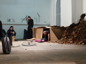 Marco Teubner entraine Julie-Andrée T. dans une cahute de carton. Tout à droite, Alastair MacLennan recouvert d’une montagne de feuilles mortes.