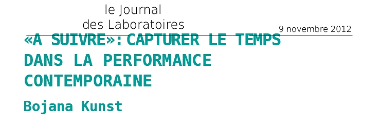 Ce numéro thématique trilingue (slovène, anglais, français) apparait comme la "conséquence créative" du projet développé lors d’une résidence de deux mois aux Laboratoires d’Aubervilliers : "A suivre" : capturer le temps dans la performance contemporaine, par Bojana Kunst entre octobre et décembre 2011. Elle a invité quatre artistes et théoricien/nes à participer à cette recherche (Danae Theodoridou, Ivana Muller, Boyan Manchev, Igor Štromajer) afin d’interroger, ensemble, les différents façons d’aborder la temporalité du travail dans l’art. Ils ont concentré leur recherche sur la relation entre le travail de l’artiste et le temps, et plus particulièrement sur la question des conditions de temporalité dans lesquelles travaillent les artistes aujourd’hui, et la façon dont cela peut façonner la production artistique contemporaine (...)